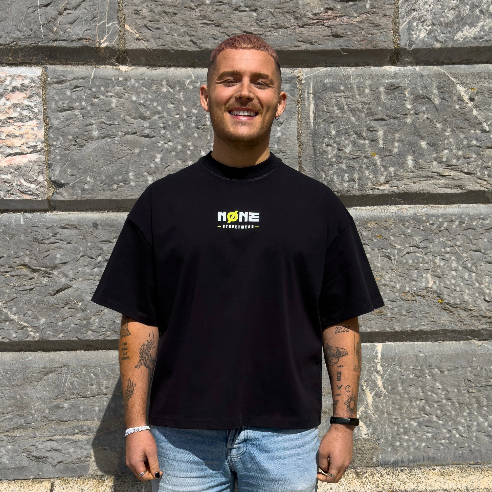 Crafted from dense 320gsm organic cotton, this black box tee features a sharp, structured fit with a minimalist NØNE logo on the front and a bold, vertical NØNE back print that defines presence.